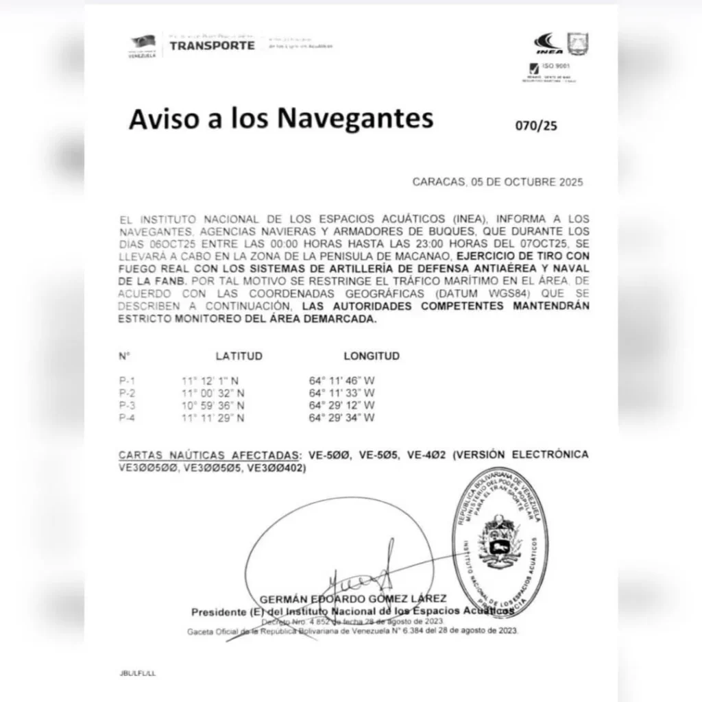 El Instituto Nacional de los Espacios Acuáticos (INEA) emitió una alerta a los navegantes para restringir el tráfico marítimo en el área demarcada durante las 48 horas de duración de las prácticas. Esta medida busca resguardar la seguridad de embarcaciones civiles, incluyendo pescadores, comerciantes y turistas.