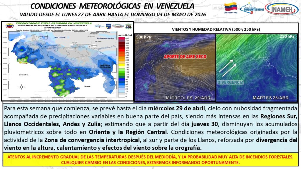 El Inameh indicó que la vaguada se refuerza por el fuerte calentamiento superficial, lo que genera inestabilidad atmosférica adicional. El organismo mantiene atención ante posibles lluvias extraordinarias.Las autoridades activaron planes preventivos en varios municipios.