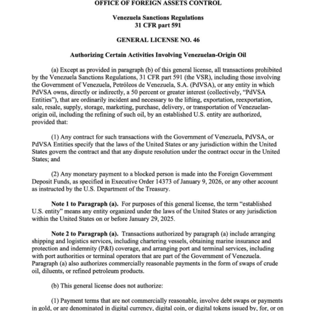 La OFAC emitió la Licencia General 46, que autoriza de forma explícita a empresas estadounidenses previamente establecidas a realizar todas las actividades necesarias para la producción, levantamiento, exportación, reexportación, venta, compra, transporte, almacenamiento, comercialización y refinación de petróleo de origen venezolano, aun cuando el régimen general de sanciones permanece vigente.