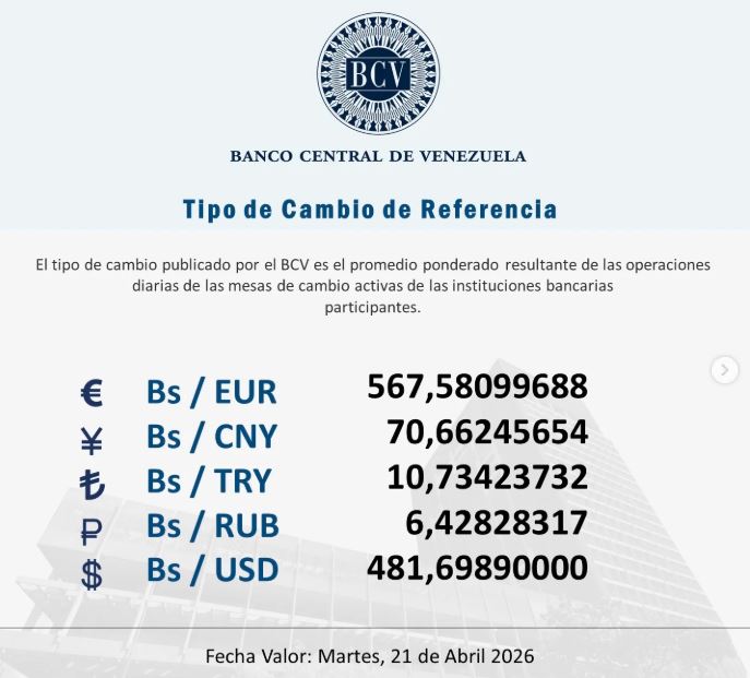 El Banco Central de Venezuela (BCV) anunció este lunes 20 de abril el nuevo ajuste en el tipo de cambio oficial que entrará en vigencia a partir del martes 21 de abril, posicionando a la divisa estadounidense en un nuevo máximo que profundiza la percepción de devaluación del bolívar en el mercado cambiario.