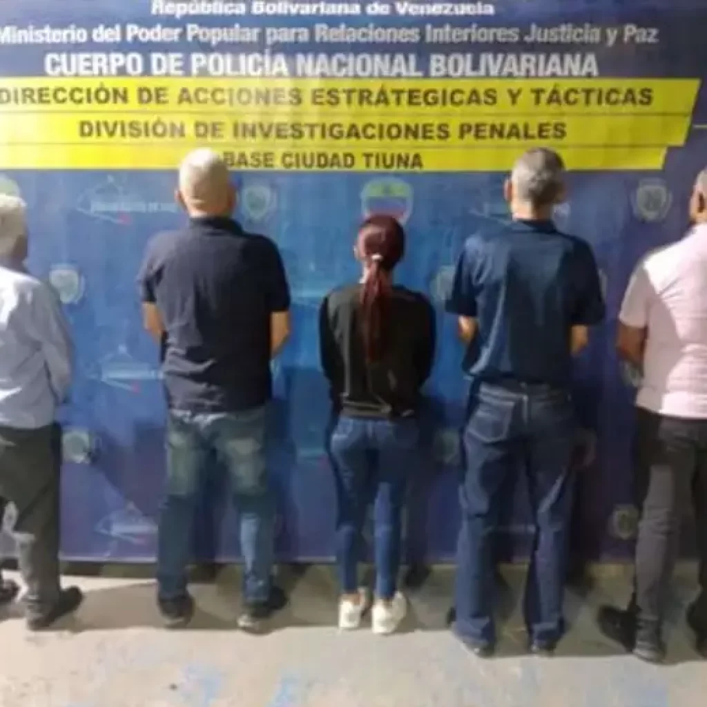 Los detenidos quedaron identificados como Simón Rafael Bravo Angulo (59), Luis Eduardo Méndez Simones (52), Martins Nobrega Da Mota (64), Cristian Eligio Alvarado Marcella (55) y Gina Dayana Calzadilla Monsalve (37).