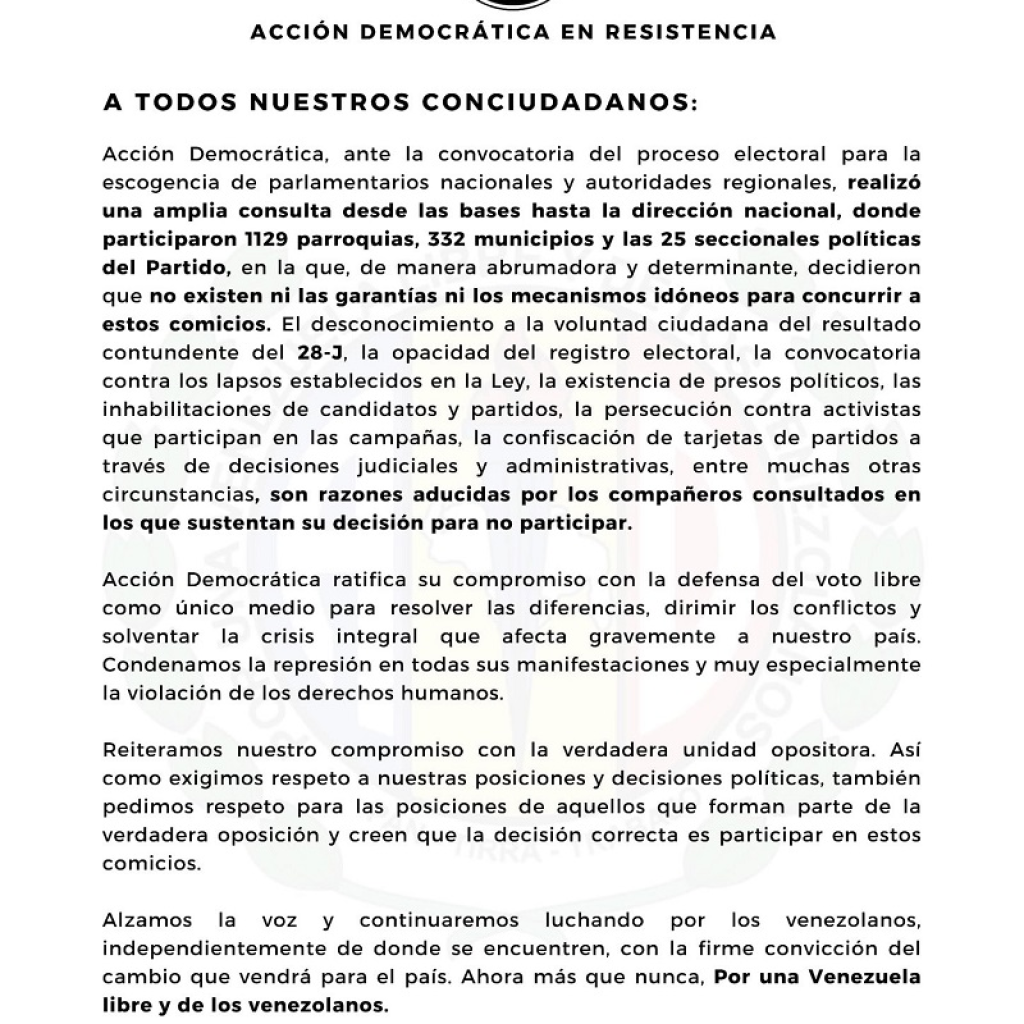 El Comité Ejecutivo Nacional del partido político Acción Democrática (AD) emitió un comunicado en el que anuncia su decisión de participar en las fraudulentas elecciones regionales y parlamentarias del 25 de mayo.