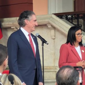 El secretario del Interior de Estados Unidos, Doug Burgum, ofreció declaraciones a la salida del Palacio de Miraflores, donde sostuvo una reunión con la gobernante encargada
